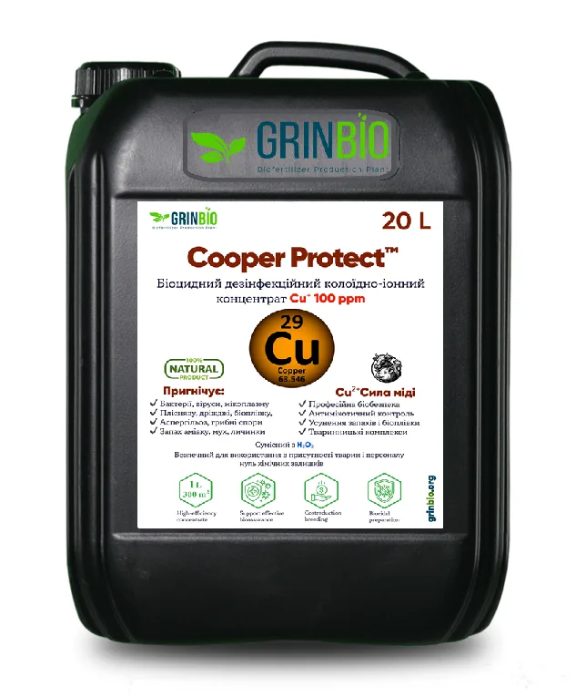 Cooper Protect™ — це інноваційний колоїдно-іонний концентрат міді, створений за запатентованою технологією GrinBio-1000™, яка формує чисті активні іони Cu⁺ та наночастинки міді без хімії, кислот, цитратів чи стабілізаторів.